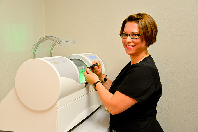It may seem hard to believe that a machine so small could make such an impact, but CEREC® works like a miniature dental lab to create ceramic crowns, veneers and more. First, it takes 3-D pictures of your mouth to create an exact map of your teeth and gums. Then it actually shapes the porcelain right here in our office to create a custom fit while you wait!